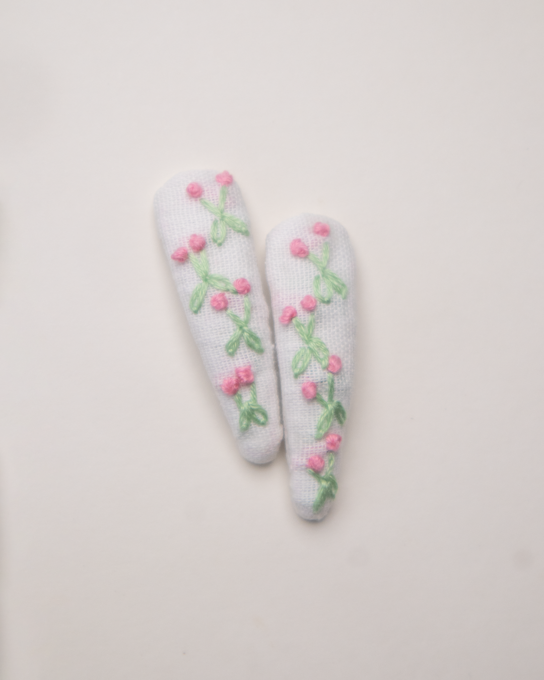 Tiny pink buds trail across soft white cotton like a dainty vine of wild berries. Hand-embroidered with care, this lightweight pair is made to stay sweet and snug all day. Comes as a pair.