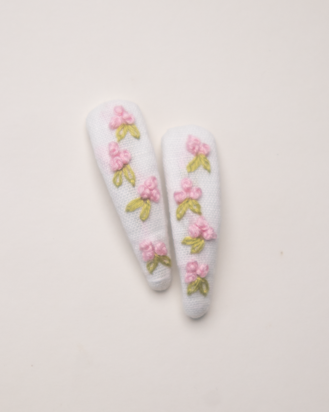 Tiny pink buds bloom gently along soft white cotton, embroidered with care for a sweet, classic look. Lightweight and secure—perfect for little moments that call for a soft touch. Comes as a pair.