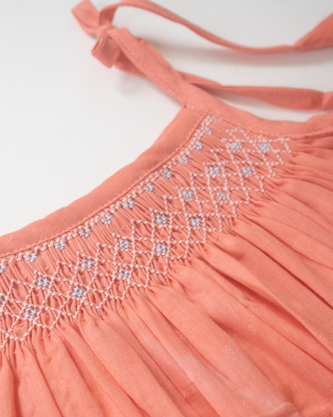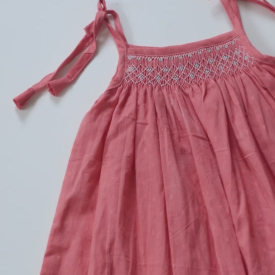 A soft candy-toned cotton dress with smocked detailing and adjustable straps.