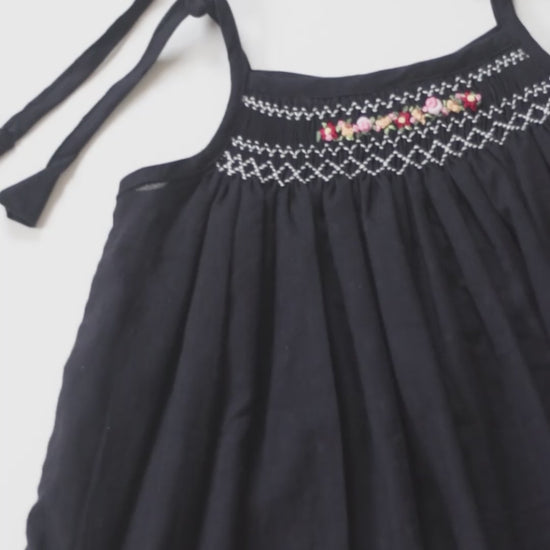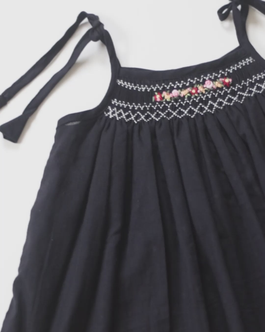 This dress is crafted from soft, breathable cotton and features hand embroidery along the yoke. With an understated silhouette and adjustable shoulder straps, it’s designed to suit both casual and occasion wear. Fits newborns to 4 years with ease and grace.