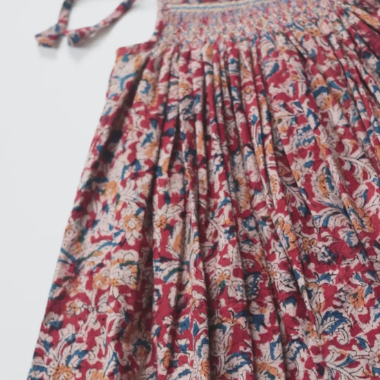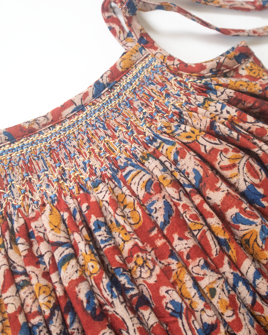 Kalamkari-style printed cotton dress with delicate hand-smocking.