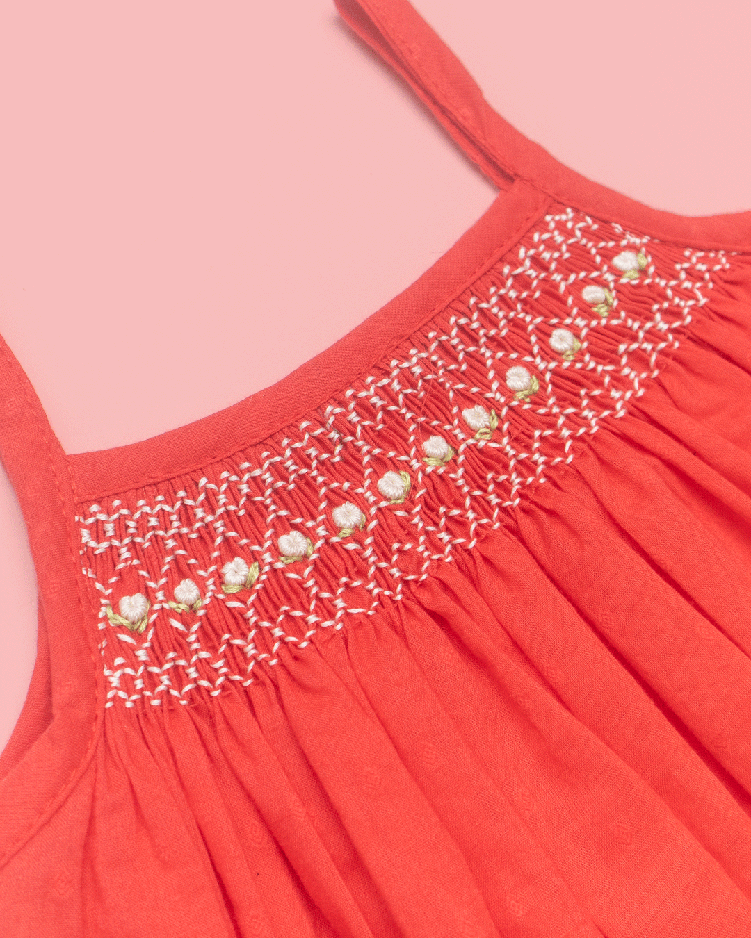 A festive piece crafted in soft cotton with hand-smocked embroidery across the yoke. Gentle gathers flow through the dress, finished with a neat ruffle at the hem. Designed to feel light, comfortable, and special for the season.