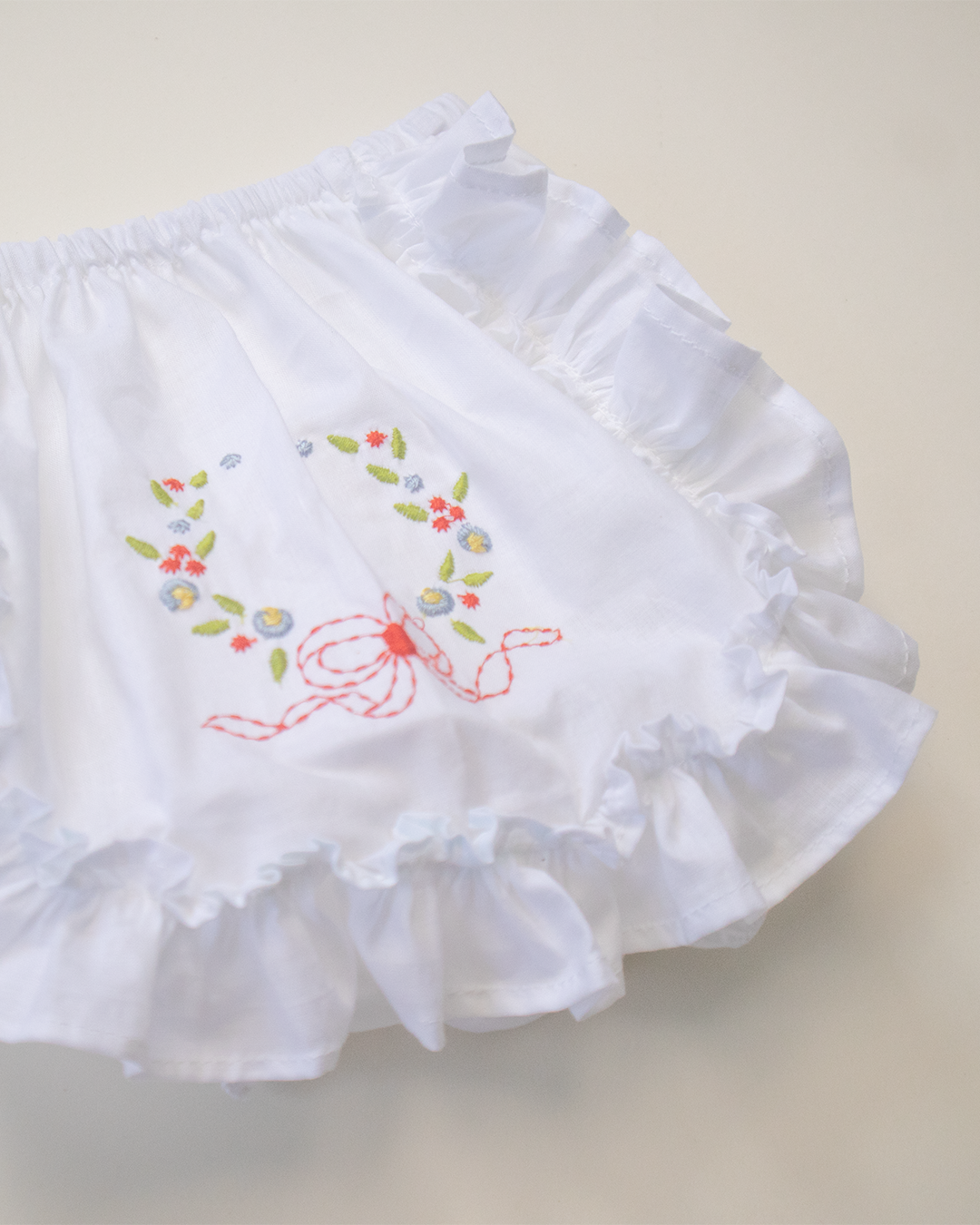 Like a little bloom in spring, the Petal Diaper Cover features embroidered florals in warm pink-red tones with a tiny bow to finish the look. Crafted from soft, breathable cotton and finished with full frills, it's as comfortable as it is charming.