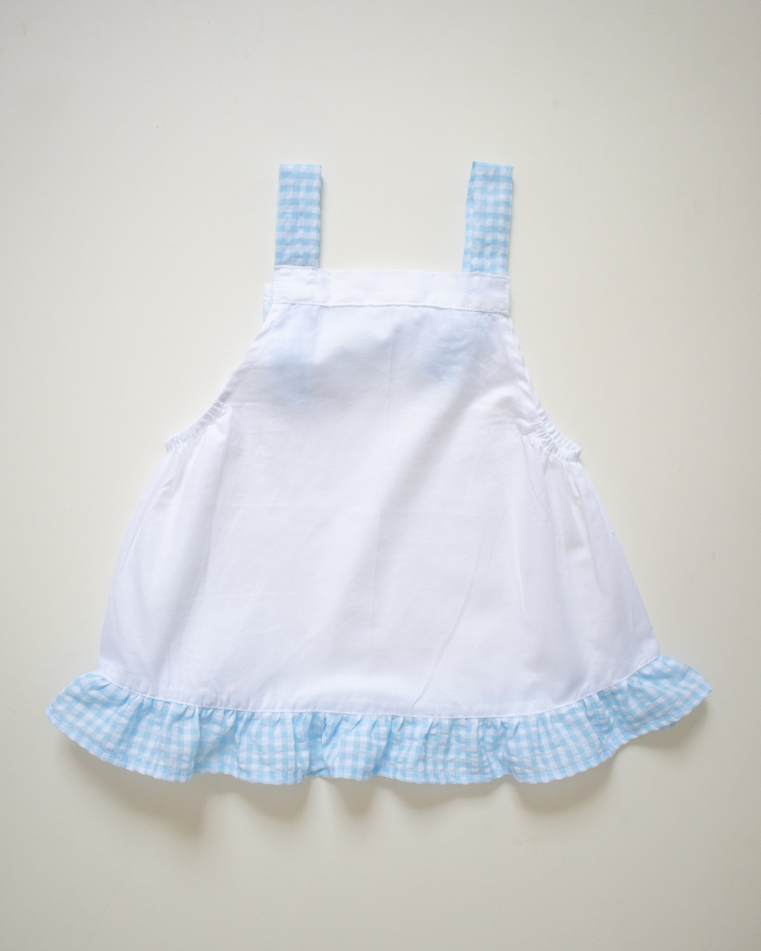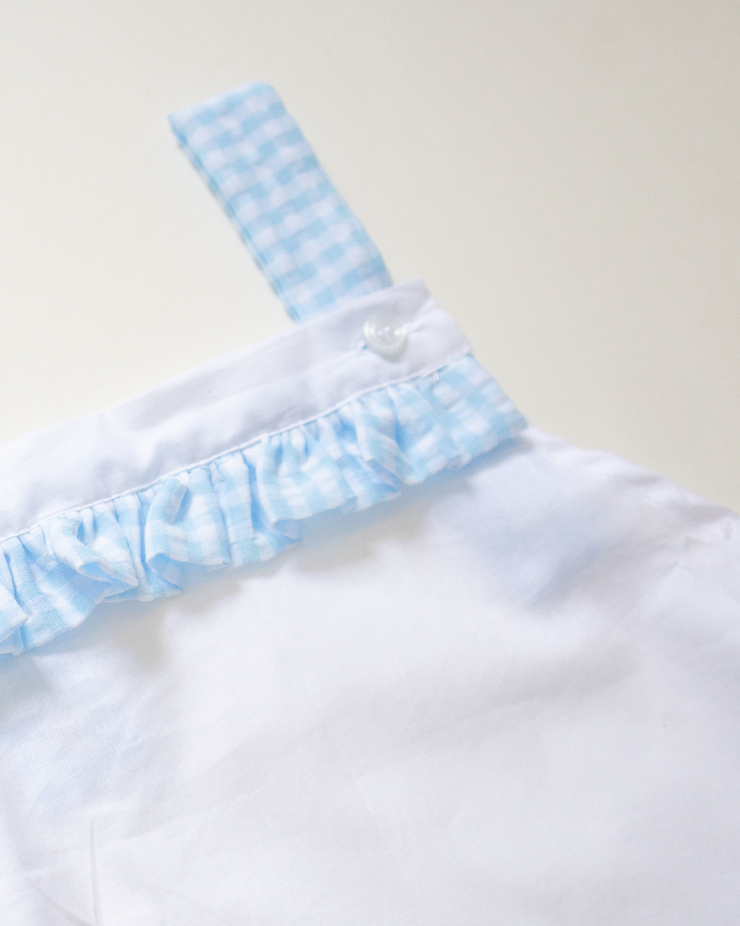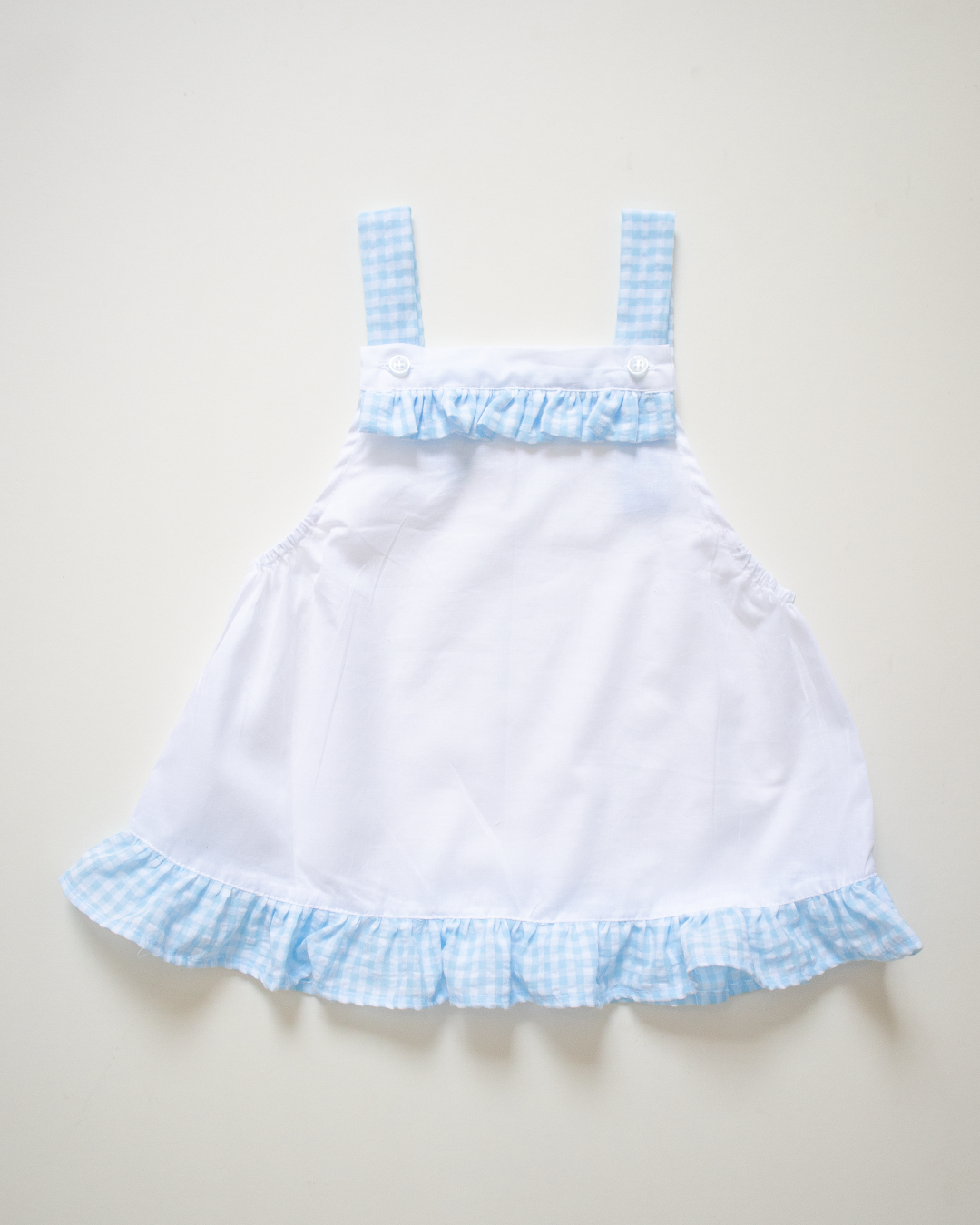 A soft whisper of blue on crisp white cotton. This set features a white dress trimmed with blue gingham ruffles and matching buttoned straps. Paired with the Skylet Diaper Cover, made in solid white cotton and finished with blue gingham frills. A breezy, lightweight look perfect for warm days.