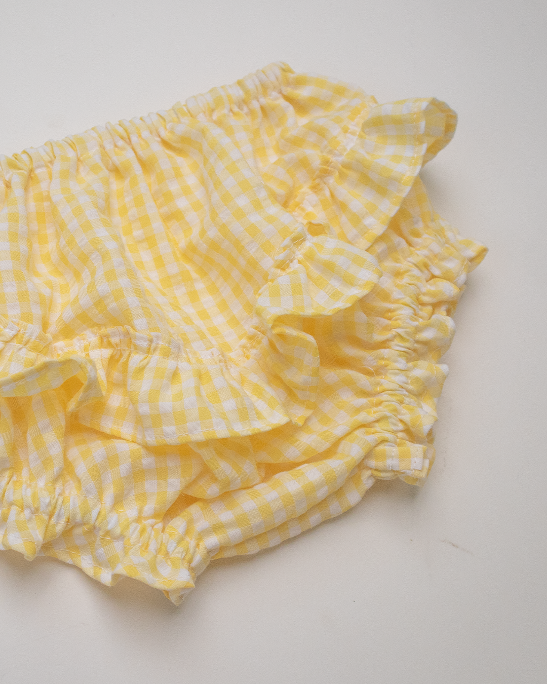 Like a little burst of sunshine, the Sunbeam Diaper Cover glows in cheerful yellow checks. With its frilly layers and soft cotton fabric, it’s built for comfort and joy. The elastic is fully covered to keep baby comfy all day long.
