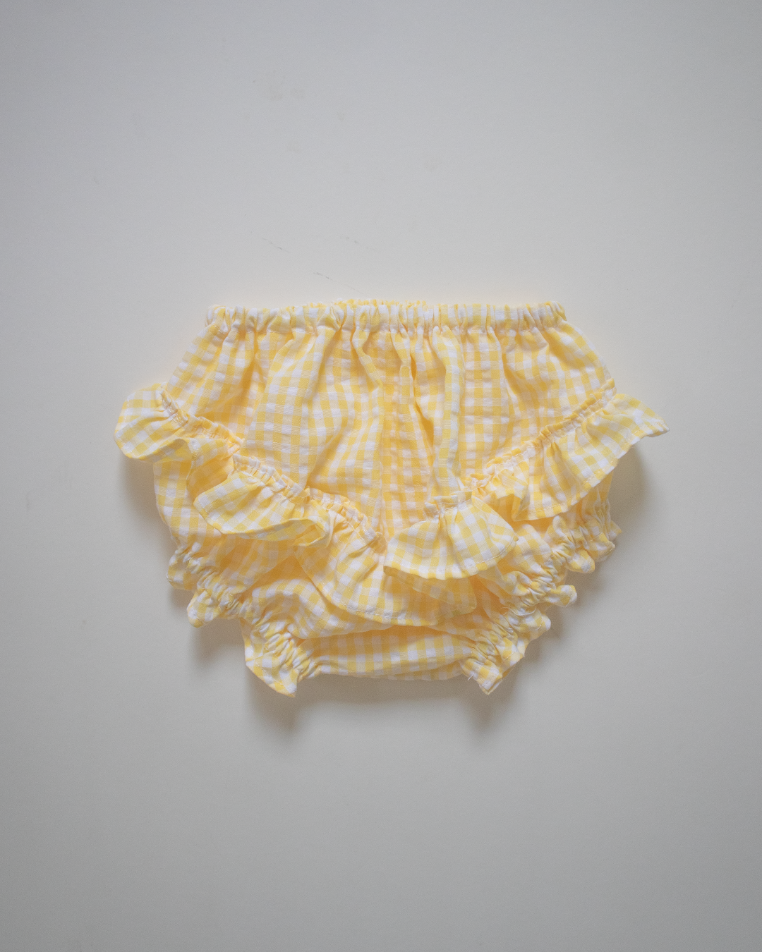 Bright and full of bounce, the Sunbeam Set features a white cotton dress trimmed with yellow gingham at the hem and bodice. The Sunbeam Diaper Cover mirrors this joy with full yellow gingham and triple ruffle layers. Playful, sunny, and made to move with ease.The waistband is gently lined with cotton, keeping elastic away from delicate skin.