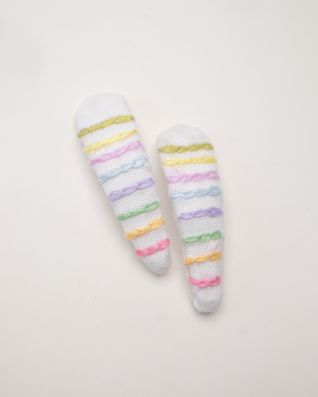 Pastel chain-stitch stripes on a soft white base—like candy for the hair. Light, snug, and easy to wear from playdates to parties. Comes as a pair.